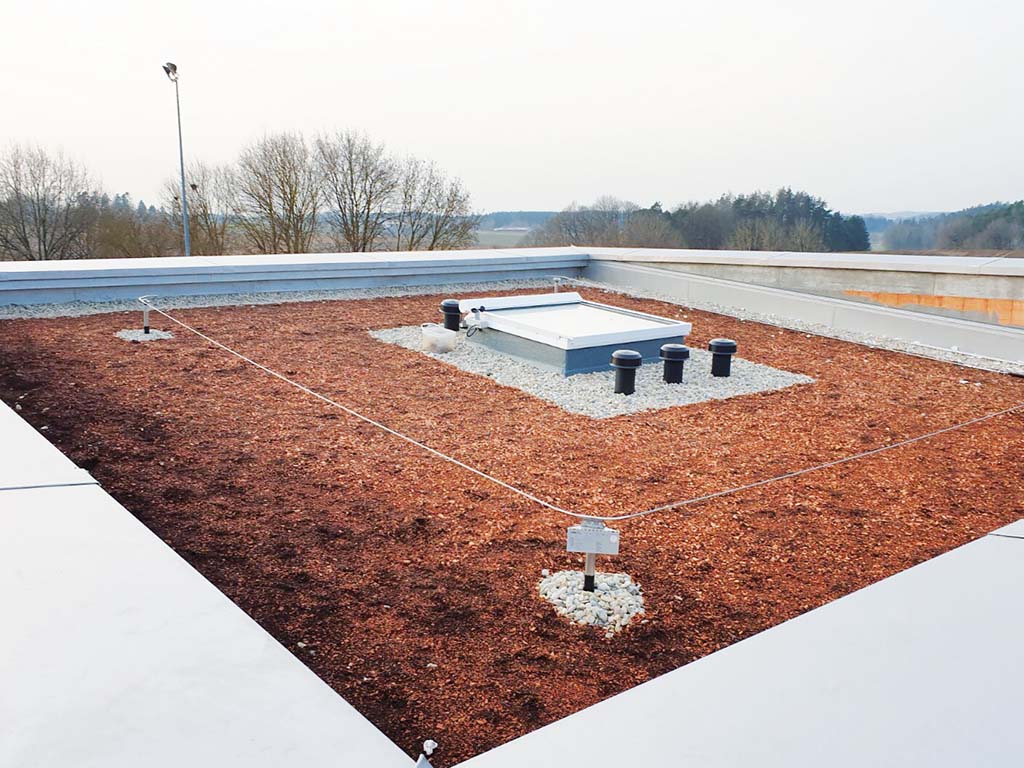 Kaltdach, Bitumenabdichtung 2-lagig (Soprema), extensive Dachbegrünung (Bauder), Anschlüsse in Flüssigkunststoff, Seilsicherungssystem (ABS