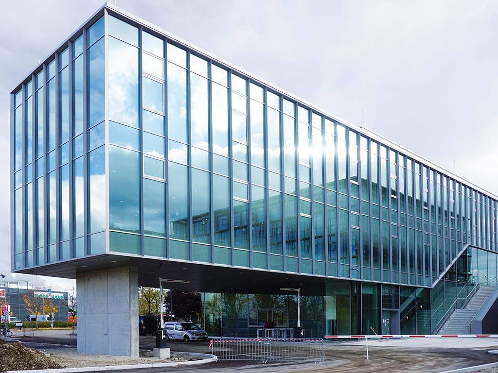 Warmdach mit Gefälle-Wärmedämmung, Abdichtung aus EPDM-Folie 1,5 mm als vorkonfektionierte Plane (Coverit), extensive Dachbegrünung (Zinco), Anschluss Folienbleche und Technikaufbauten mit Flüssigkunststoff (Soprema), Seilsicherungssystem (ABS), Entwässerung (Loro), Lichtkuppeln/RWA (Jet/Velux), Verblechung Alu farbbeschichtet (Coverit Abdichtungssysteme GmbH