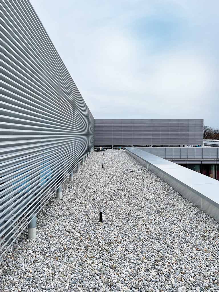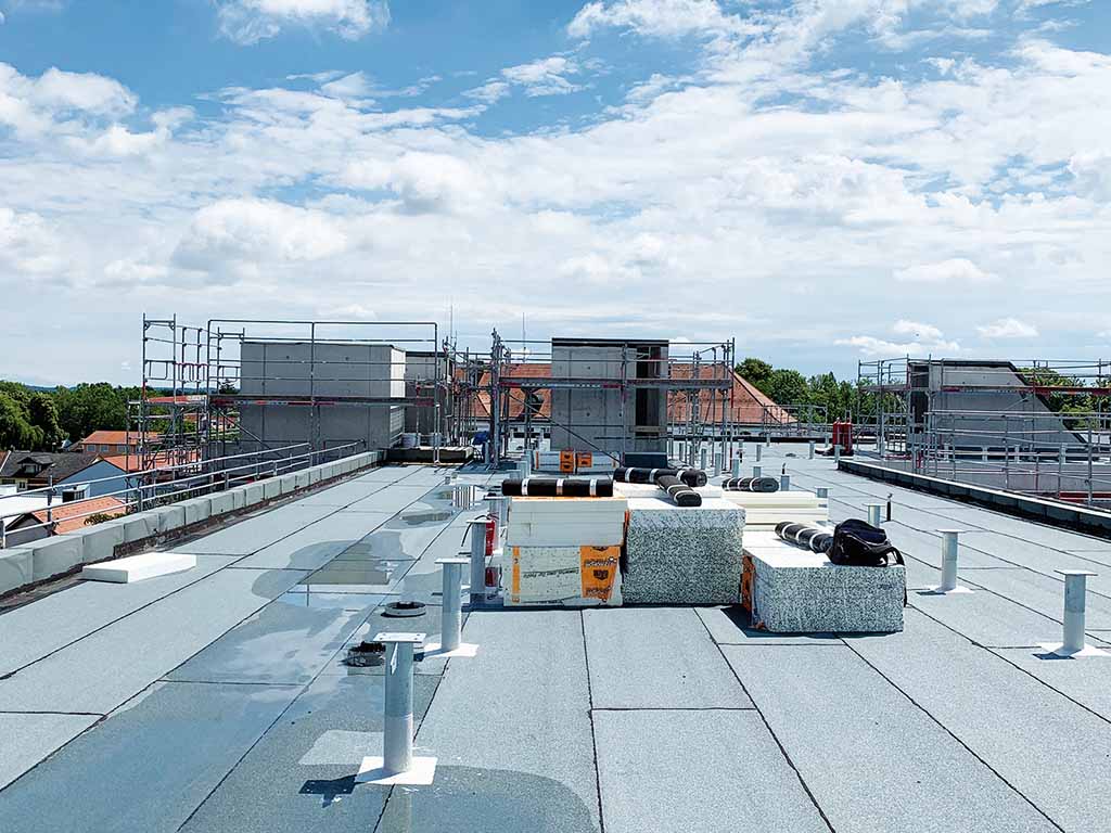 Wärmedämmung EPS, Bitumenabdichtung 2-lagig (Soprema), wurzelfest, extensive Dachbegrünung (Bauder), Lichtkuppeln/RWA/ Dachoberlichter (Jet/Velux)